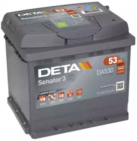 Battery Brand: DETA Battery Code: DA530 Voltage: 12 V Battery Capacity: 53 AH Cold Cranking Amps (CCA): 540 A Length: 207 Width: 175 Height: 190 Post Positions: 0 Terminal Type: EN Hold-down Type: B13 |